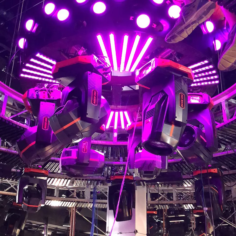 Hệ thống xếp tầng đơn giản hóa: Đèn sân khấu sự kiện này có hệ thống kết nối "chuỗi cúc" tiêu chuẩn cho cả tín hiệu và nguồn điện, tạo điều kiện thuận lợi cho việc lắp đặt trên không với mật độ cao, quy mô lớn.